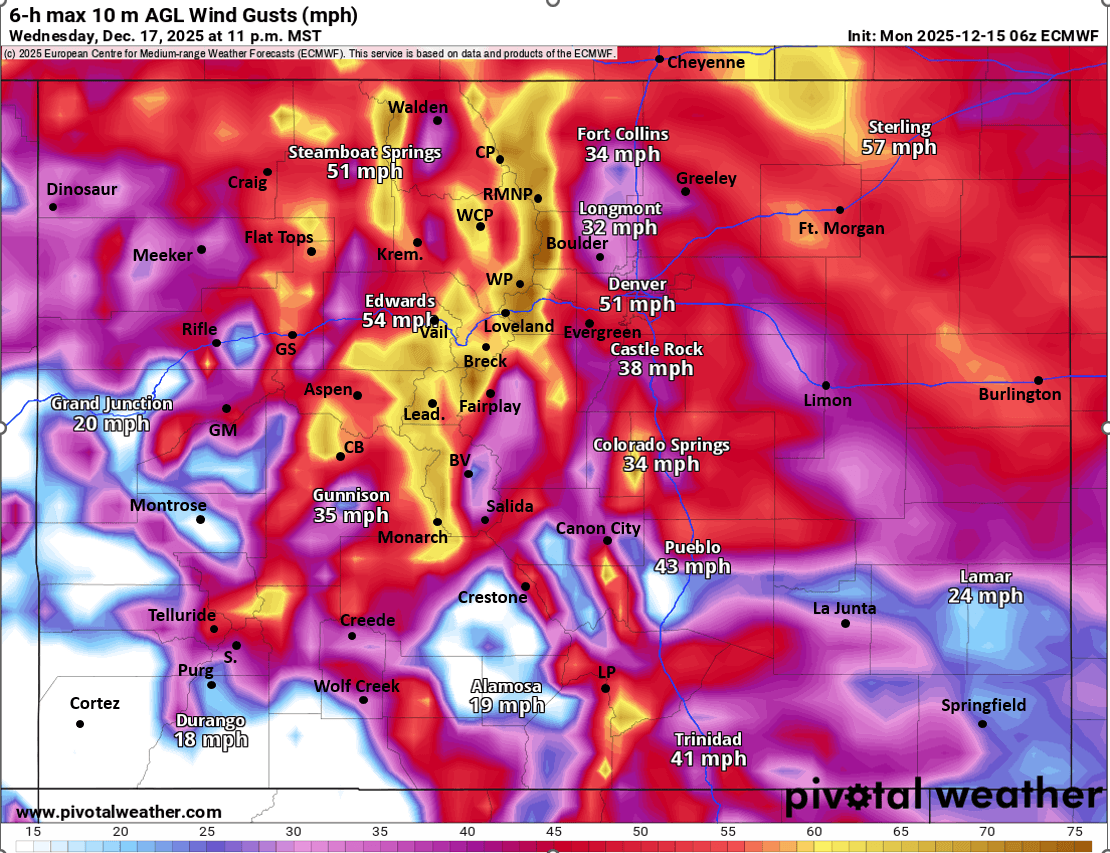 Also looks like some strong wind for the front-range (Den/Bou) from about 5pm Wed through 5pm Thu: northwest wind-gusts of 20-50mph, stronger in the foothills.