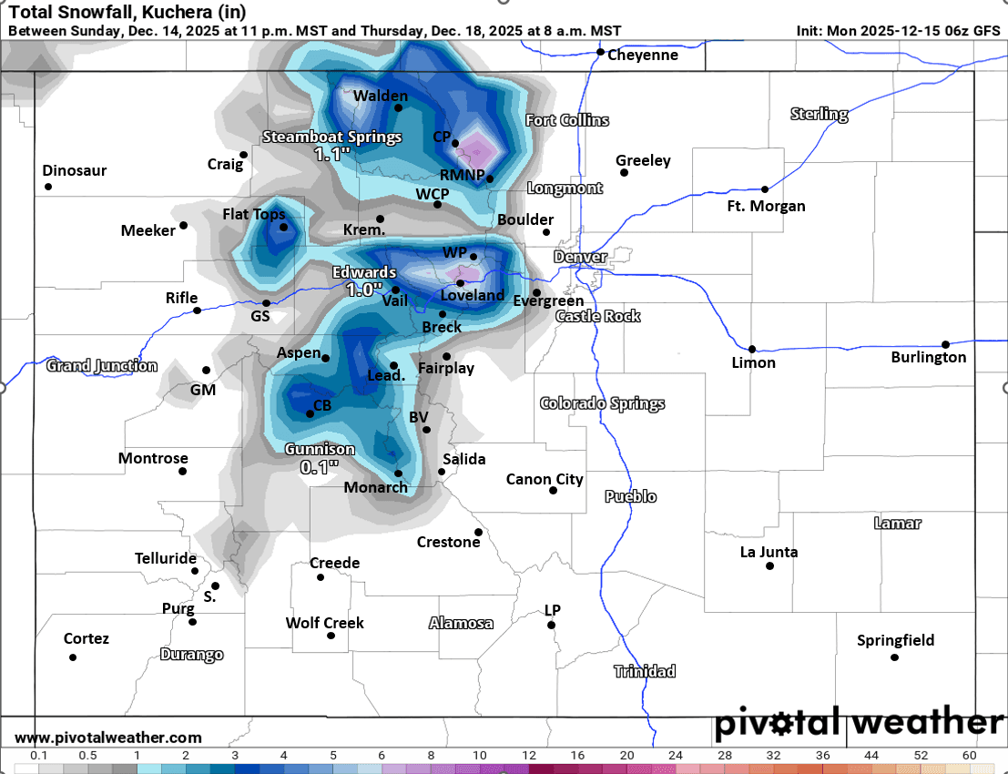 More light snow for the north-central mountains from 5pm Thu to 5am Fri (1-4" additional). Then even more snow for the mountains and ski areas likely from 8am Sat through 5am Sun: additional 1-5" likely favoring northern / northwest CO.