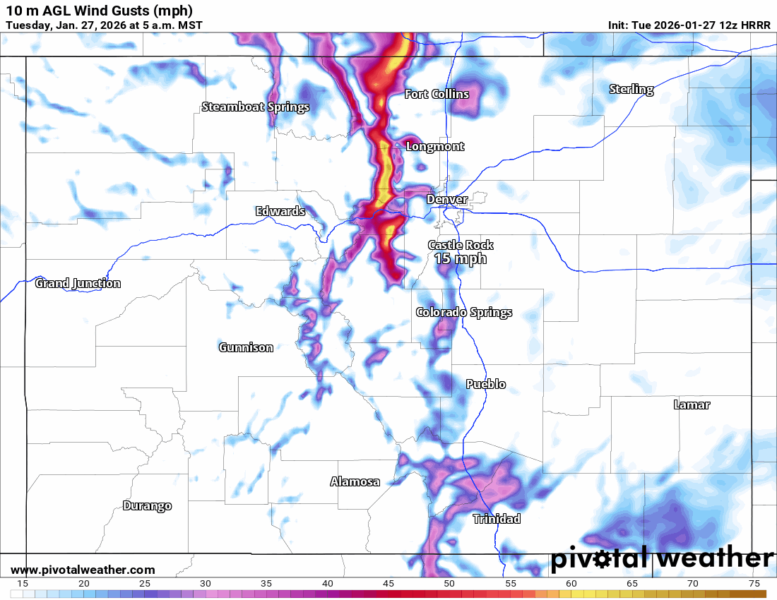 01/27/26 8:45am: Morning, its Tuesday. It will be windy over the Front Range mountains today, Wed and Thu. It will turn windier for Den/Bou and the lower elevations on Wed evening into Thu (as a short-wave moves through). Some snow still expected for the northern mountains on Wed night through mid-day Thu.