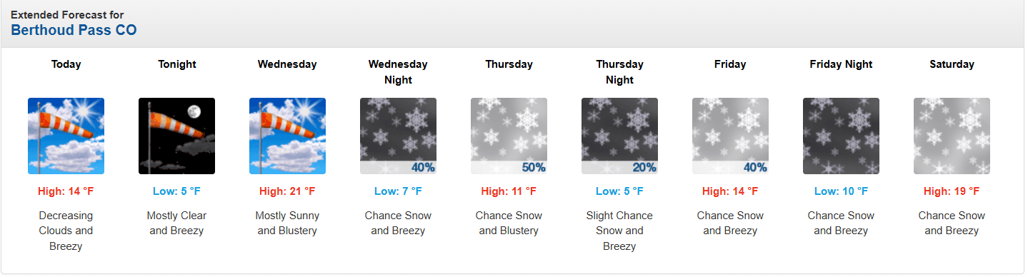 First image loop shows forecast wind-gusts over the next 48hrs (5am this morning to 5am Thu) from latest HRRR model. Second image shows forecast total snowfall from now through 2pm Thu from very latest GFS (take with grain of salt, doesn't resolve mountain / valley features). Images 3 and 4 compare 5-day forecasts for Berthoud Pass and Denver from NWS.